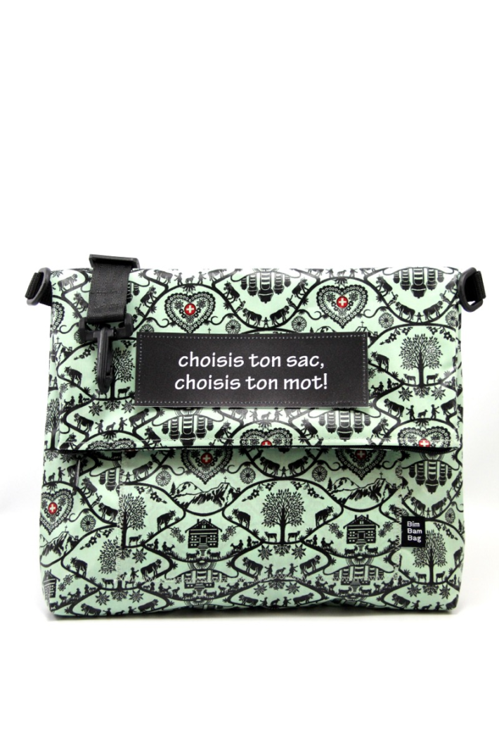 est une besace pliée en deux, en toile enduite imperméable.Création artisanale made in Vevey.