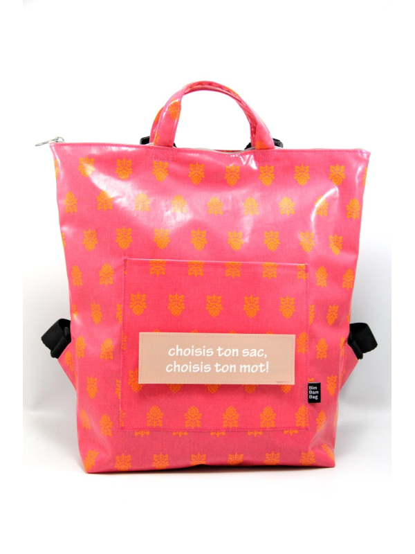 Il a une poche intérieure cousue en applique et une poche extérieure cousue aussi en applique avec un velcro pour y coller une étiquette-mot de votre choix à compter en plus dans le prix du sac.