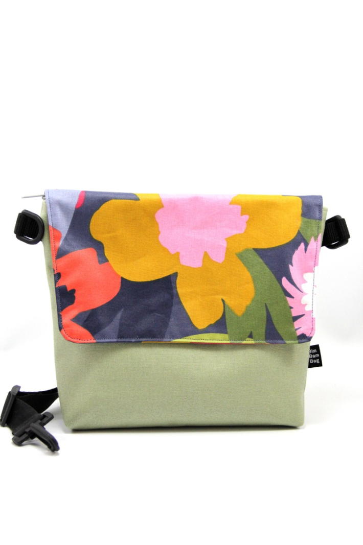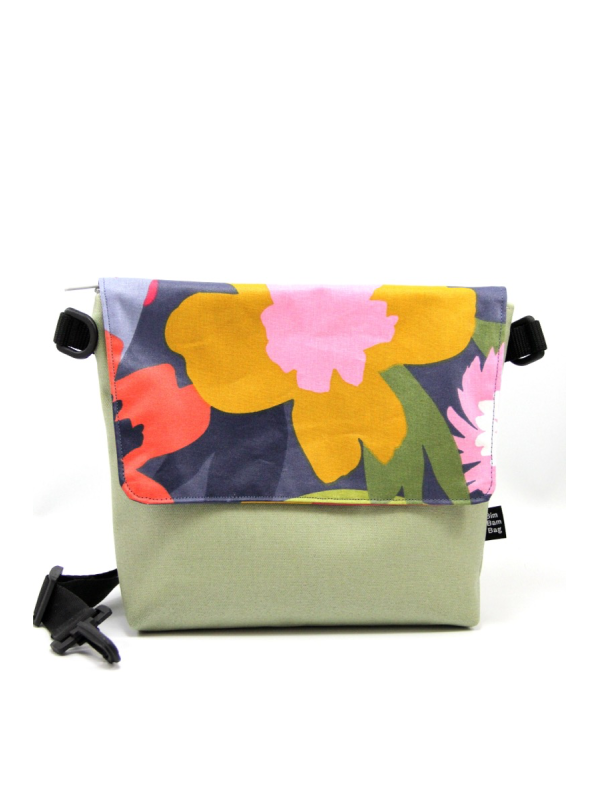 Ce Capucine est un sac en bandoulière de format carré en canevas enduit, avec un rabat en toile enduite cousu.