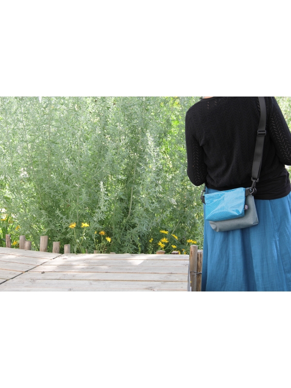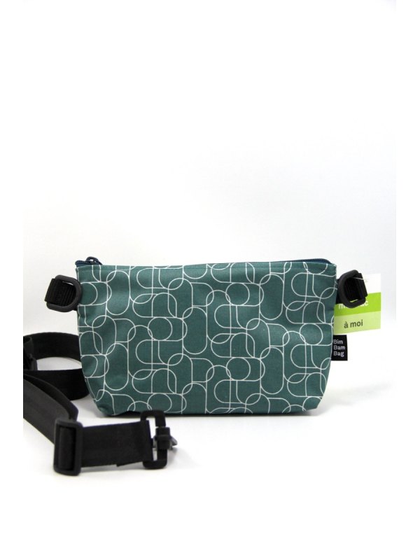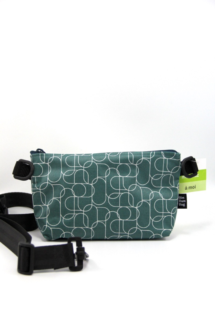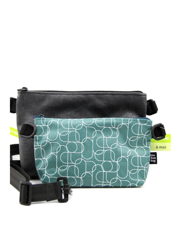 Bandoulière de 3 cm de large réglable sur laquelle s'accrochent les 2 petits sacs.