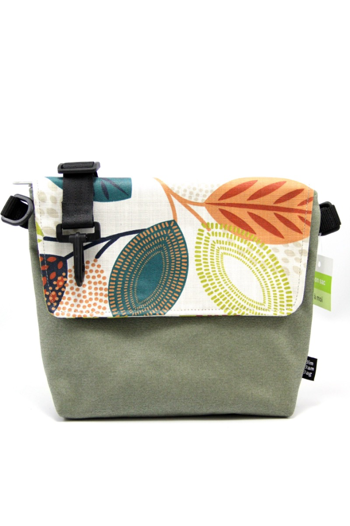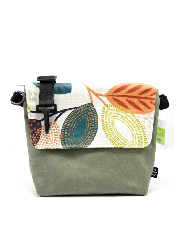 Ce Capucine est un sac en bandoulière de format carré en canevas enduit, avec un rabat en toile enduite cousu.