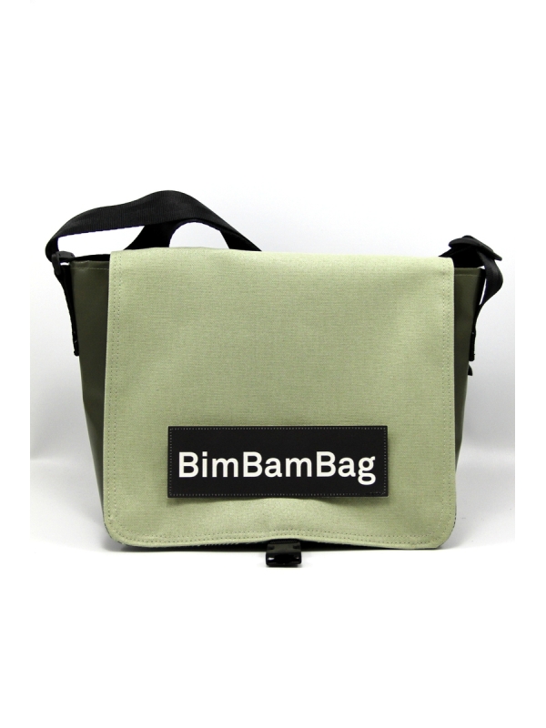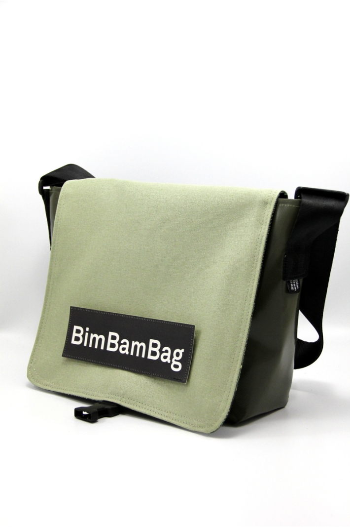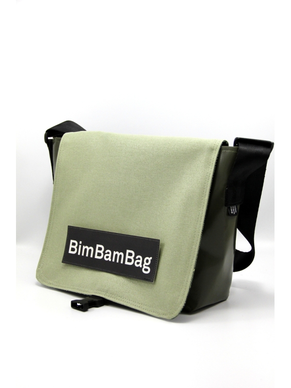 La petite sacoche en bâche "Mercredi Soir", son rabat uni non réversible, cousu sur le fond en bâche, avec une étiquette-mot à scratcher dessus.
