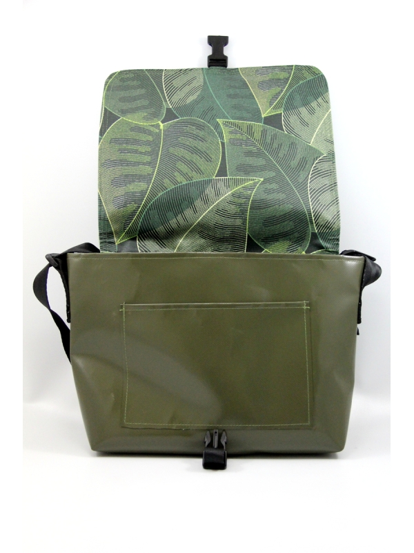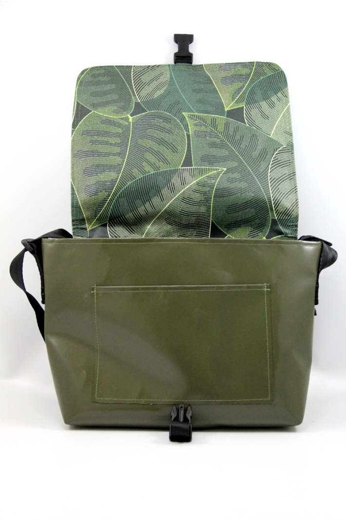 Le rabat est en canevas de coton enduit dessus et en toile enduite fantaisie dessous et il est cousu sur la base en bâche du sac.