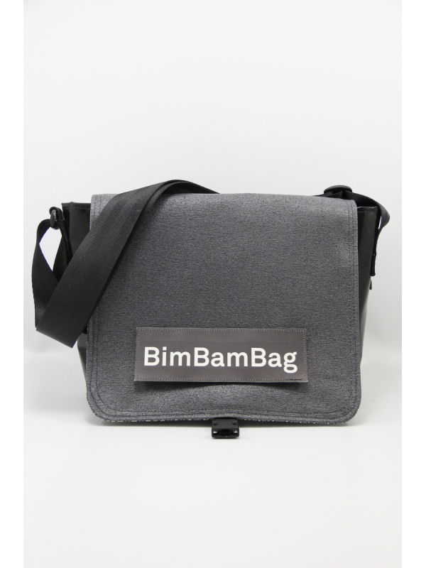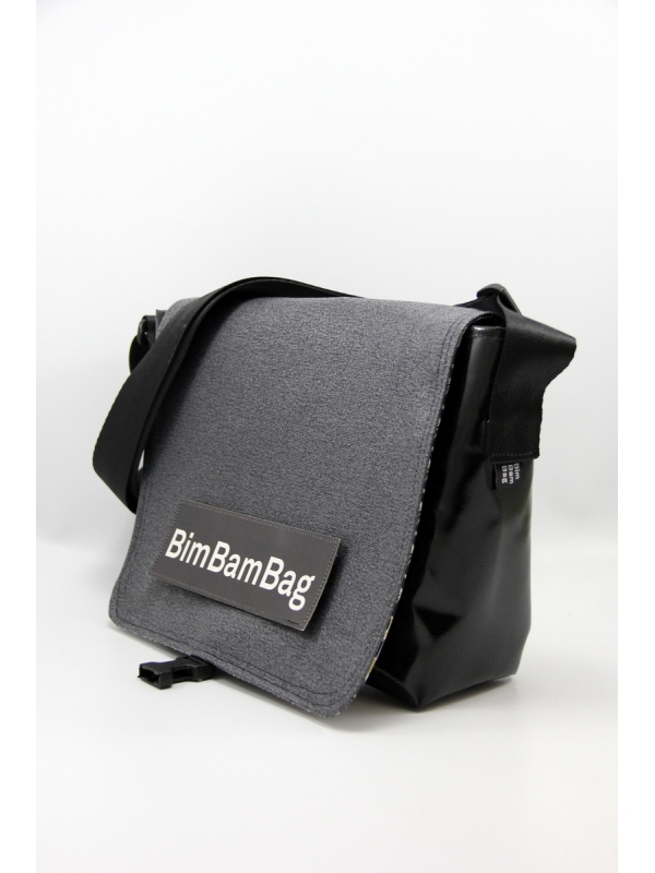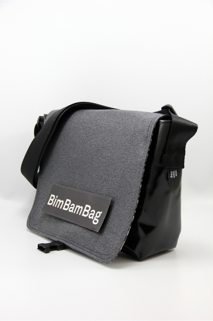La petite sacoche en bâche "Mercredi Soir", son rabat uni non réversible, cousu sur le fond en bâche, avec une étiquette-mot à scratcher dessus.
