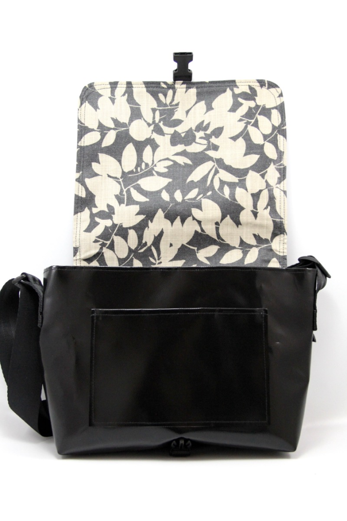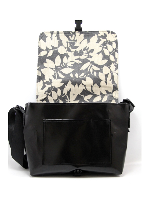 Le rabat est en canevas de coton enduit dessus et en toile enduite fantaisie dessous et il est cousu sur la base en bâche du sac.