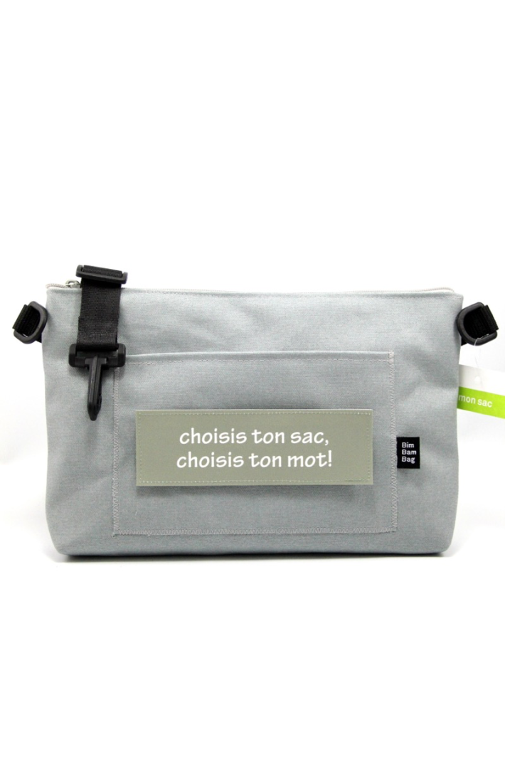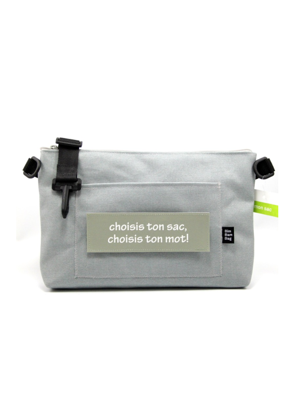 En toile de canevas enduit avec une poche en applique sur le devant et un velcro pour y coller un mot de votre choix à compter en plus dans le prix du sac.