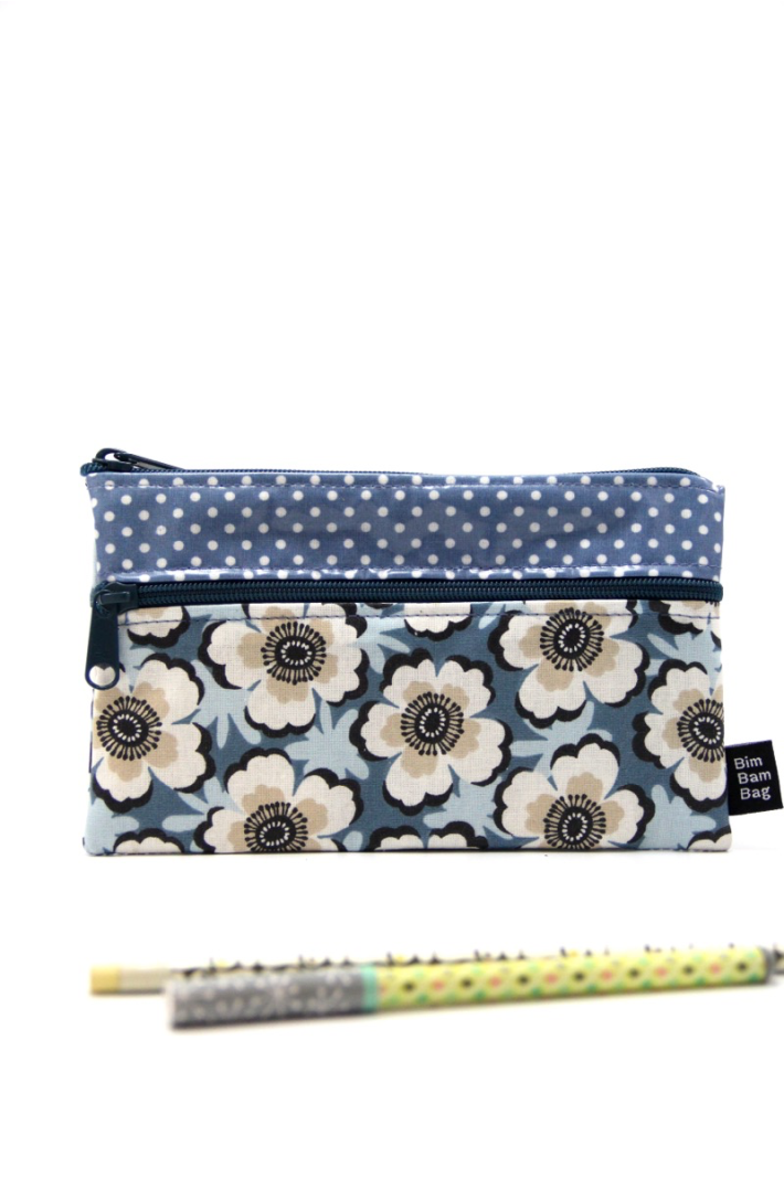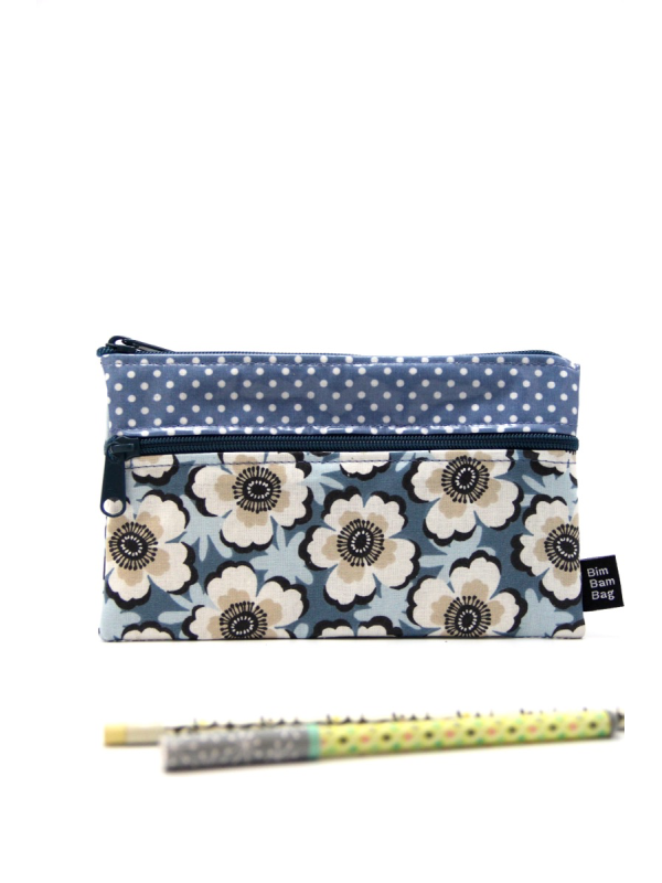 Trousse plate en toile enduite avec 2 compartiments et 2 fermetures éclair.
